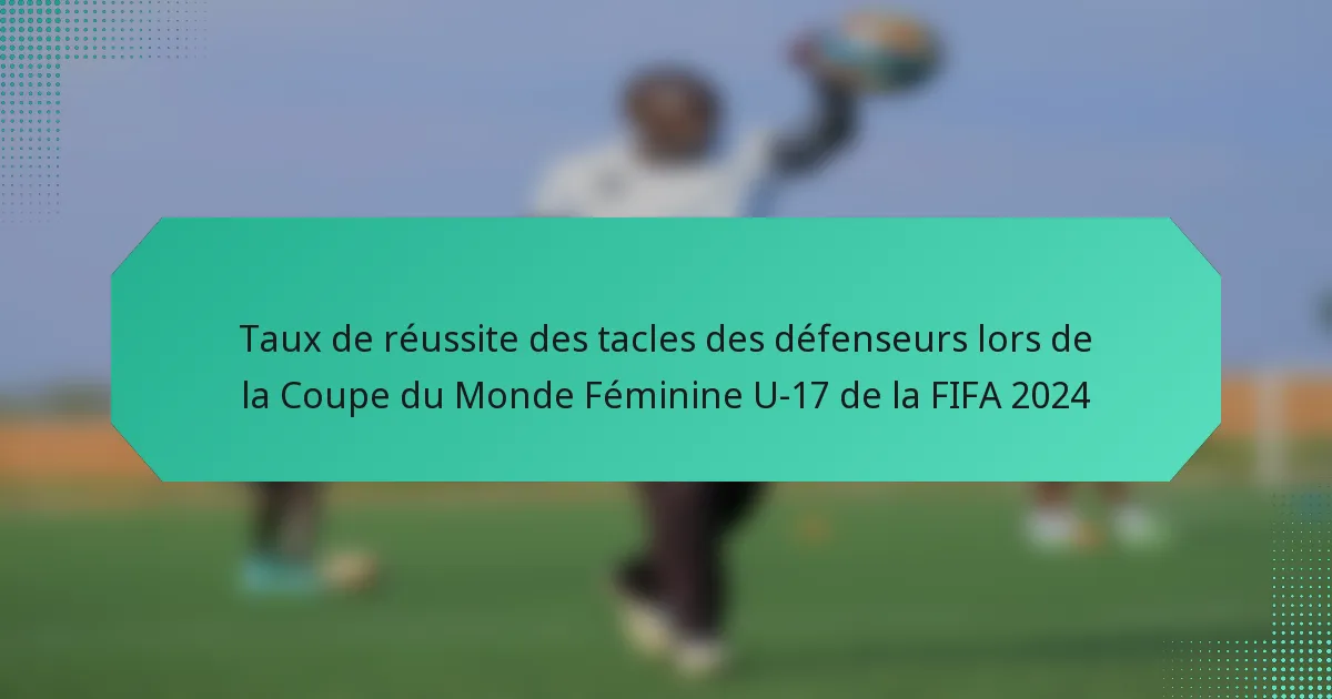 Les taux de réussite des tacles pour les défenseurs lors de la Coupe du Monde Féminine U-17 de la FIFA 2024 mettent en évidence l’efficacité variable des joueuses dans le fait de déposséder leurs adversaires tout en maintenant leur discipline. Le tournoi de cette année a vu des défenseurs démontrer des compétences exceptionnelles, de nombreuses équipes mettant en œuvre des stratégies agressives qui ont conduit à des taux de réussite plus élevés par rapport aux éditions précédentes. En conséquence, les défenseurs remarquables non seulement améliorent leur performance individuelle, mais jouent également un rôle crucial dans les succès de leurs équipes sur la scène mondiale.